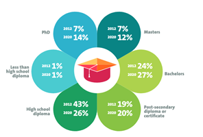 This graphic illustrates the number of jobs in the industry based on levels of education, comparing numbers from 2012 to 2020: